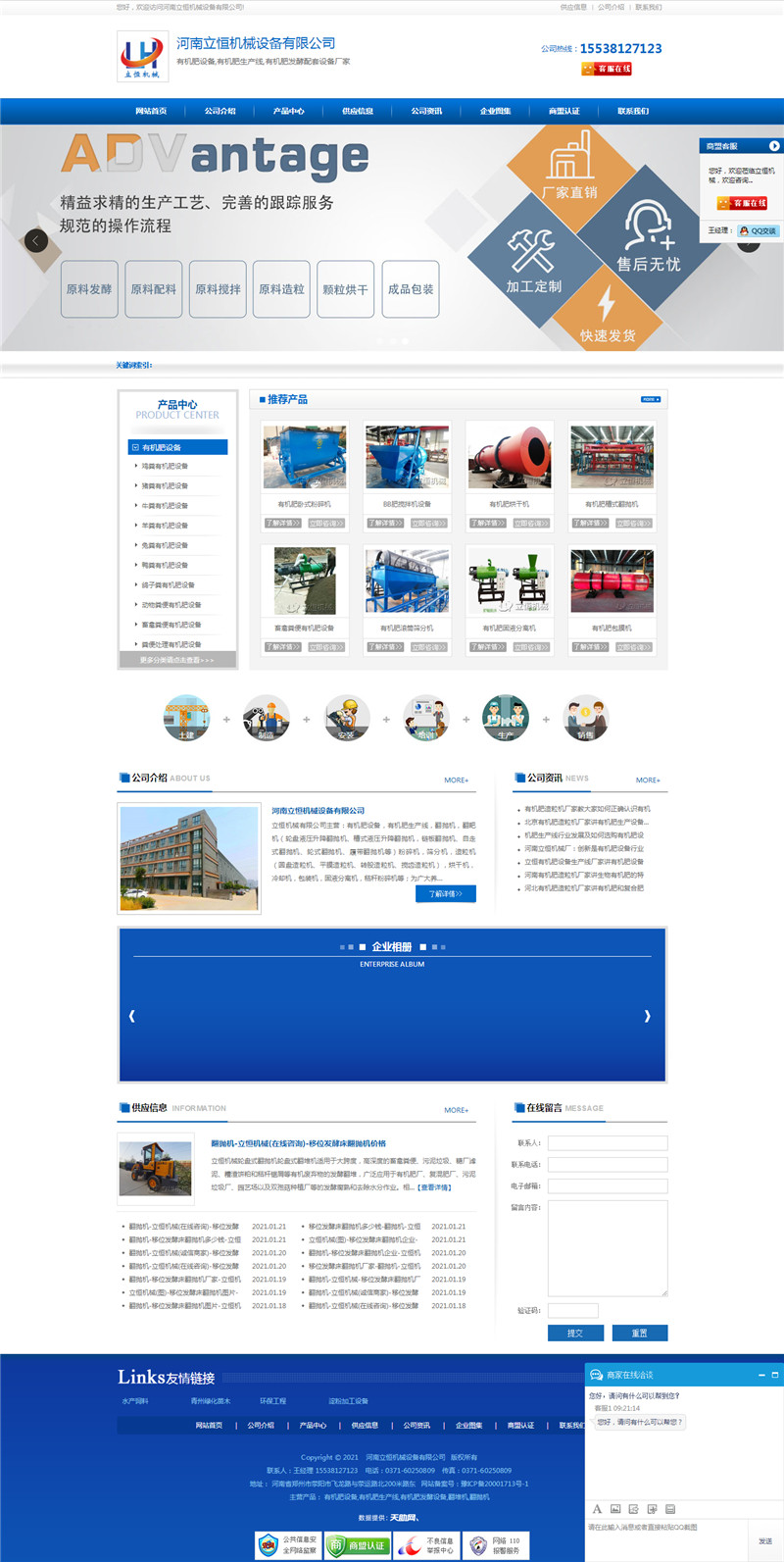 河南立恒機(jī)械設(shè)備有限公司近期在我公司開通推廣業(yè)務(wù),同時(shí)易站通網(wǎng)站制作完成并上線。易站通網(wǎng)站就是用已經(jīng)成形的網(wǎng)站為框架進(jìn)行套用,可以在后臺(tái)進(jìn)行設(shè)置網(wǎng)站的一些信息,把這個(gè)網(wǎng)站改變成自己需要的網(wǎng)站信息。兩個(gè)網(wǎng)站分別www.cnzzsm.com有機(jī)肥造粒機(jī)網(wǎng)站,www.zgzzty.com有機(jī)肥生產(chǎn)線設(shè)備,網(wǎng)站整體上美觀大方,信息完整!主站域名www.hnlhjx.cn.