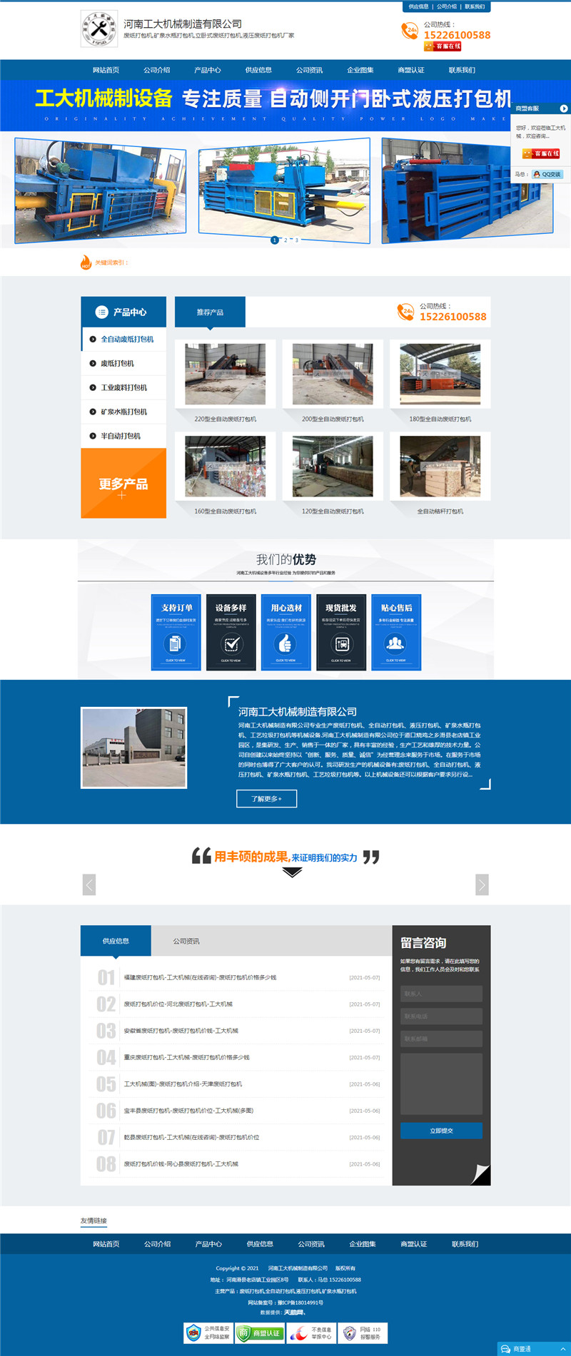 河南工大機(jī)械制造有限公司專業(yè)生產(chǎn)廢紙打包機(jī)、全自動(dòng)打包機(jī)、液壓打包機(jī)、礦泉水瓶打包機(jī)、工藝?yán)虬鼨C(jī)等機(jī)械設(shè)備